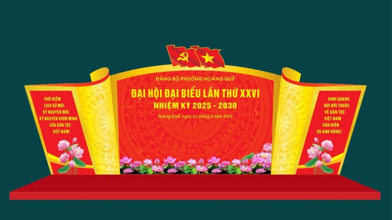 Nhiều mẫu background Đại hội Đảng bộ hiện nay được thiết kế theo phong cách truyền thống với tông màu đỏ – vàng nổi bật, kết hợp các biểu tượng quen thuộc như quốc kỳ, búa liềm hoặc họa tiết hoa sen. Bên cạnh đó, một số thiết kế hiện đại cũng sử dụng bố cục tối giản để tạo cảm giác gọn gàng nhưng vẫn giữ được sự trang trọng cần thiết. Tham khảo các mẫu sau: