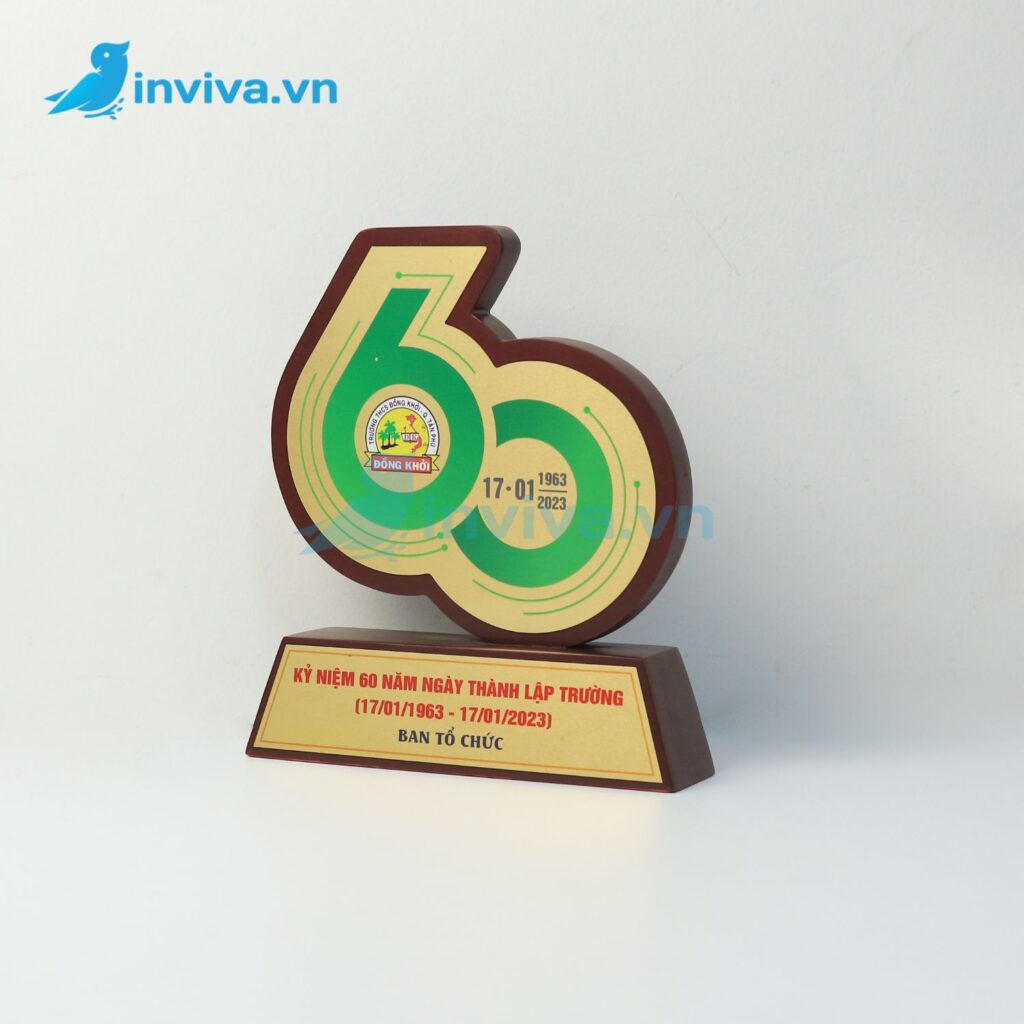 Gỗ tự nhiên kết hợp họa tiết đồng ánh kim. | Bền, thẩm mỹ cao, mang giá trị truyền thống và văn hóa. | Trọng lượng nặng, giá cao hơn mica và thủy tinh. | Lễ kỷ niệm thành lập, vinh danh giáo viên, sự kiện văn hóa. |