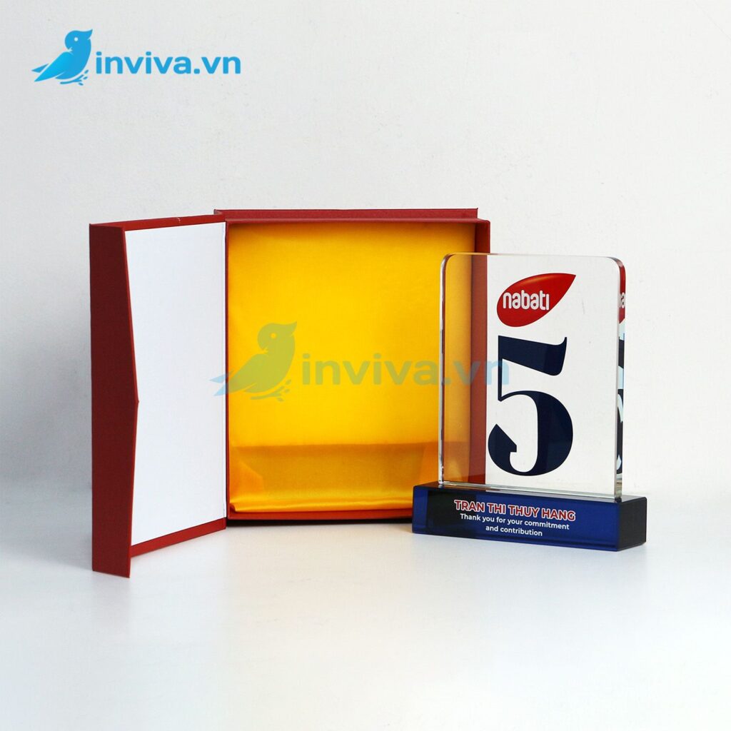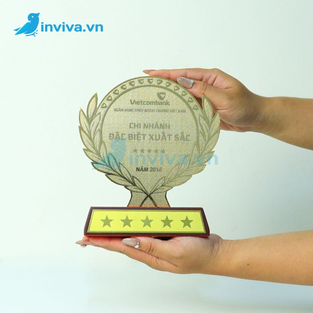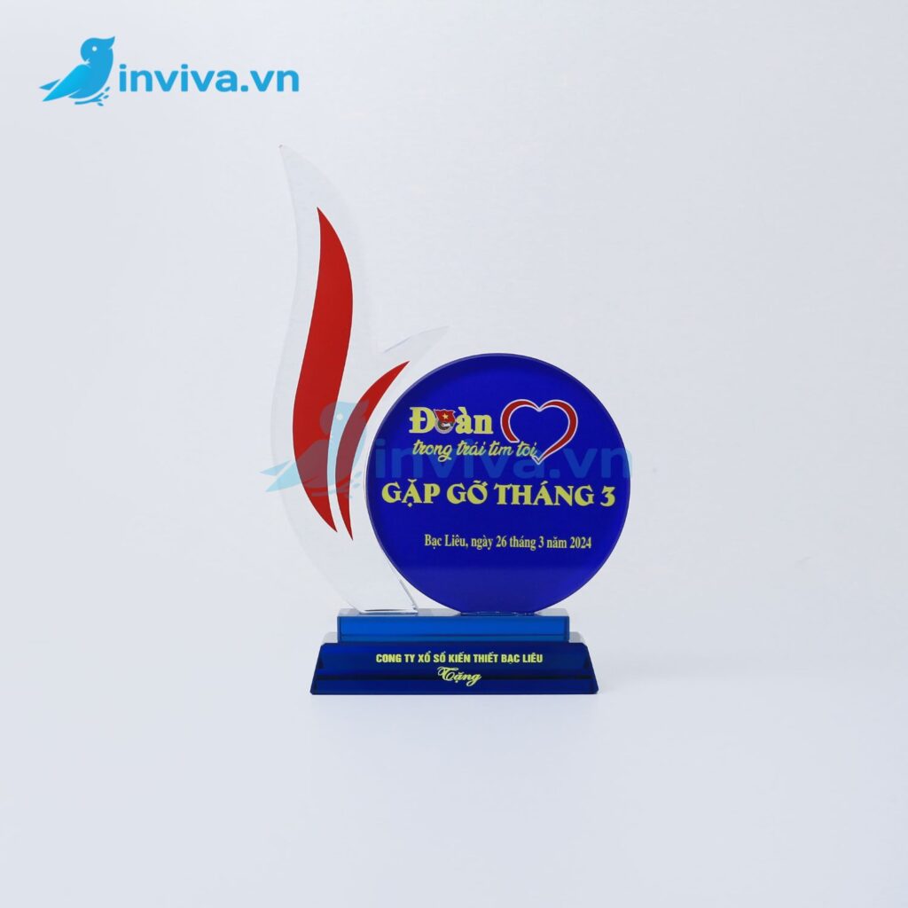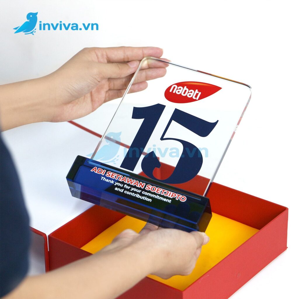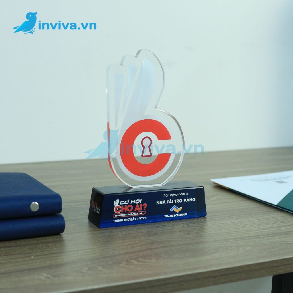- Chất liệu Mica (Acrylic): Nhẹ, bền, chi phí tiết kiệm, dễ tạo hình, phù hợp sự kiện đông người, trao tặng số lượng lớn.