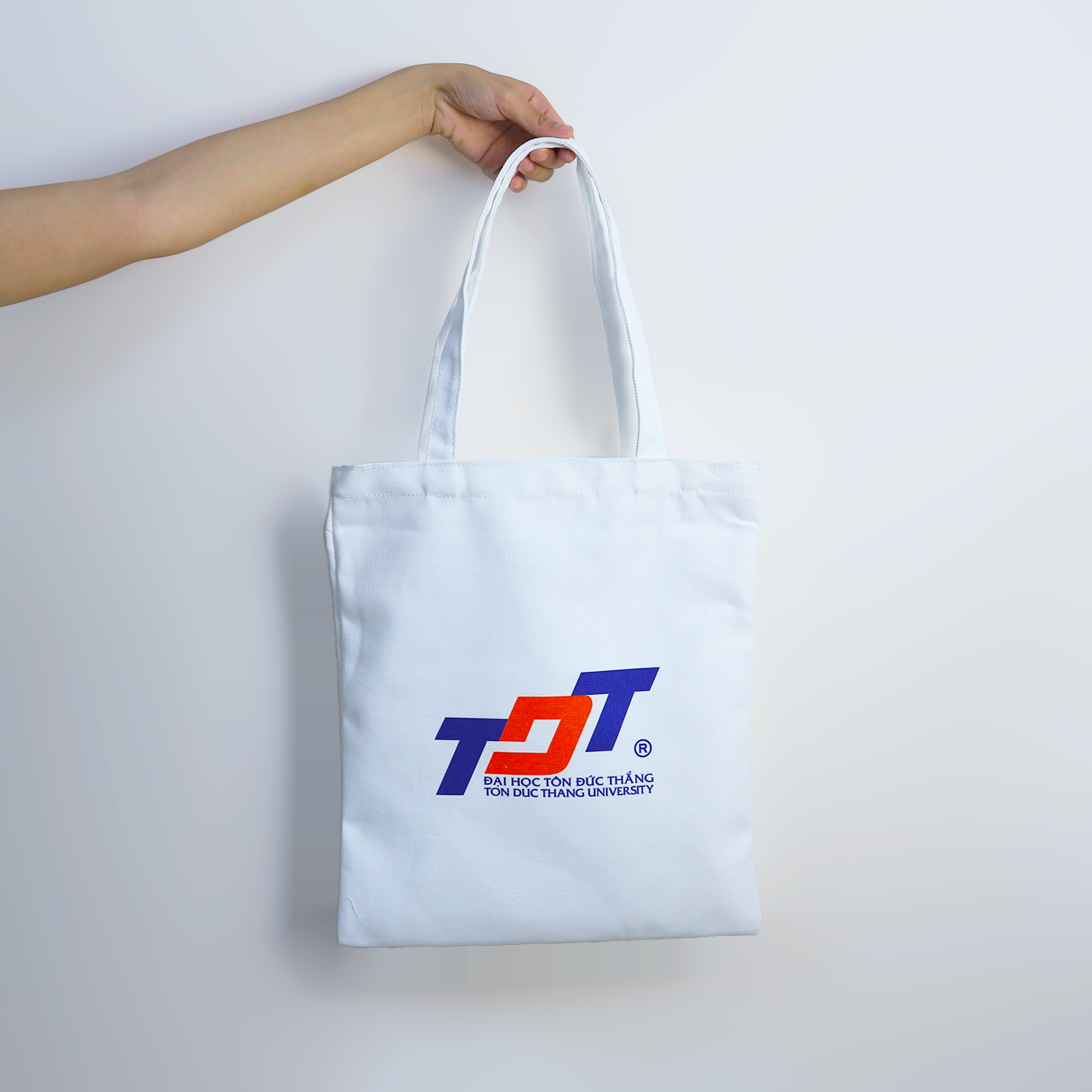 | Logo TDTU trắng đen | Phiên bản tối giản, độ tương phản cao cho các kỹ thuật in đặc thù. | Khắc laser trên bình giữ nhiệt gỗ, in lụa 1 màu lên túi vải canvas. |