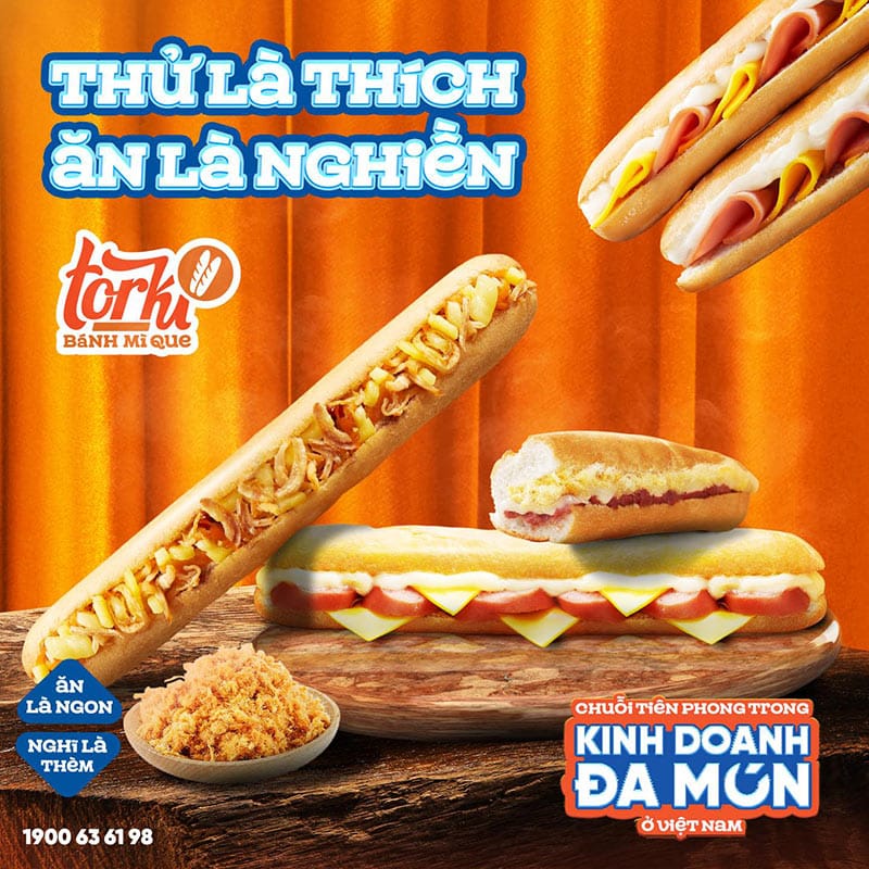 Dành cho các chuỗi cửa hàng bánh mì que, poster thường sử dụng các gam màu nóng như cam, đỏ hoặc vàng chanh để kích thích cảm giác thèm ăn. Hình ảnh những chiếc bánh mì que thon dài xếp lớp, kết hợp với các hiệu ứng vệt sốt rực rỡ tạo nên sự bắt mắt cho khách hàng trẻ tuổi và học sinh, sinh viên.